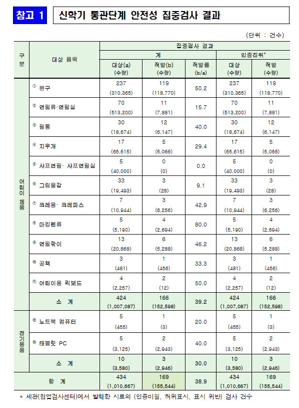 2025년 3월 27일, 산업통상자원부와 관세청은 신학기를 맞아 어린이 제품에 대한 통관단계 안전성 집중검사를 실시한 결과, 15만여 점의 안전기준 미준수 수입품을 적발했다고 발표했다. 이번 검사는 2월 5일부터 2월 25일까지 진행되었으며, 학용품과 완구 등 어린이들이 많이 사용하는 제품을 대상으로 하였다.