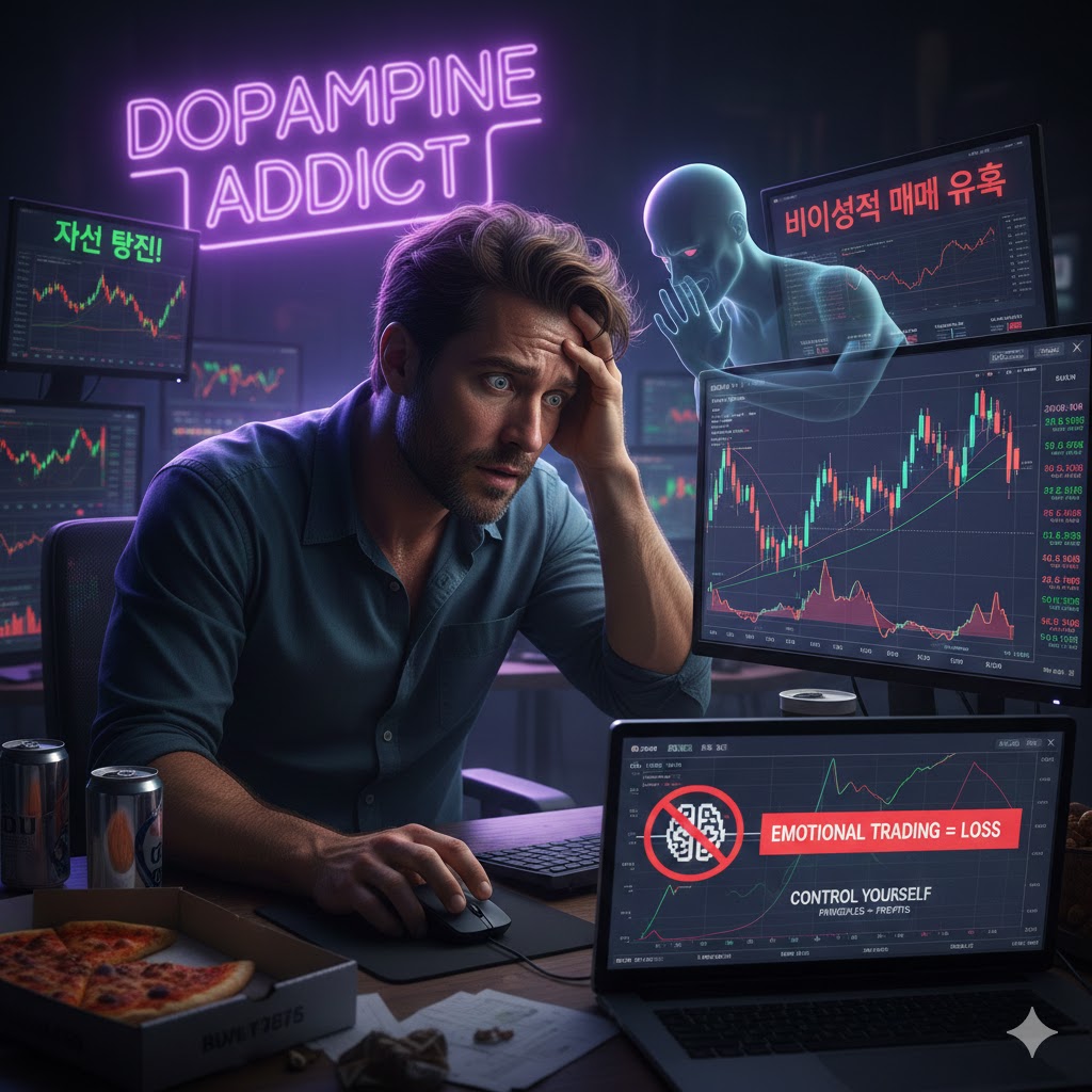 주식 매매 시 발생하는 짜릿함은 뇌에서 도파민을 분비시킨다. 이를 스스로 통제하지 못하면 투자자는 도박 중독과 유사한 상태에 빠지게 된다. 도파민에 휘둘린 뇌는 손실을 만회하기 위한 무리한 '물타기'나 변동성이 극심한 고배율 ETF(곱하기 3 ETF)로 눈을 돌리게 만든다.