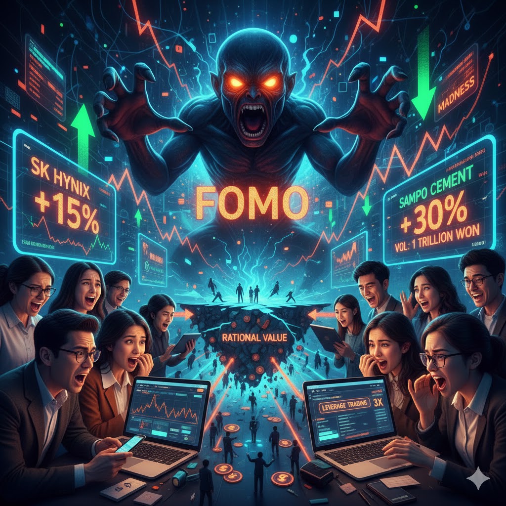 이러한 심리적 불안은 충동적인 추격 매수로 이어진다. 최근 삼표시멘트의 사례가 대표적이다. 성동구 부지 개발 호재로 거래대금이 1조 원 이상 폭증하며 주가가 급등락을 반복했다. 시장 전문가들은 이를 세력의 움직임보다는 기회를 놓쳤다는 공포에 휩싸인 개인 투자자들이 대거 유입되어 만들어낸 '광기'의 결과로 분석한다. 상한가 매매나 무리한 레버리지 투자가 성행하며, 이성적인 가치 판단이 들어설 자리는 갈수록 좁아지고 있다.